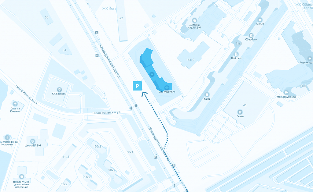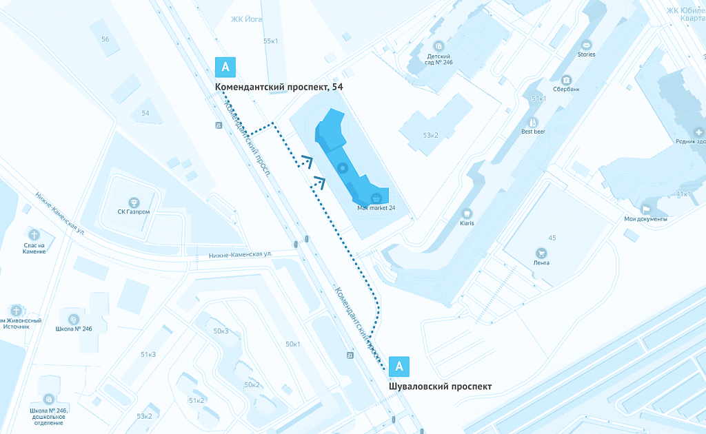 выходите на остановке на пересечении Комендантского и Шуваловского проспектов.