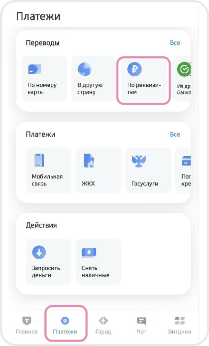 1. Выберите раздел «Платежи», в категории «Переводы» выберите «По реквизитам».